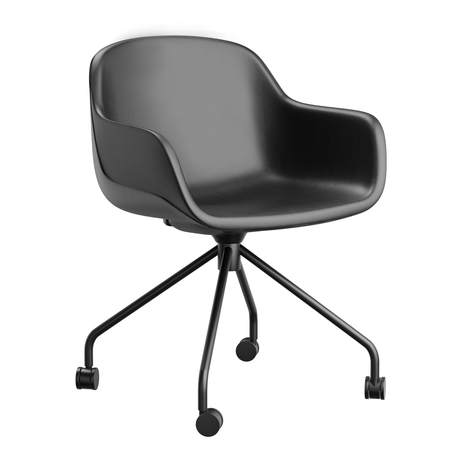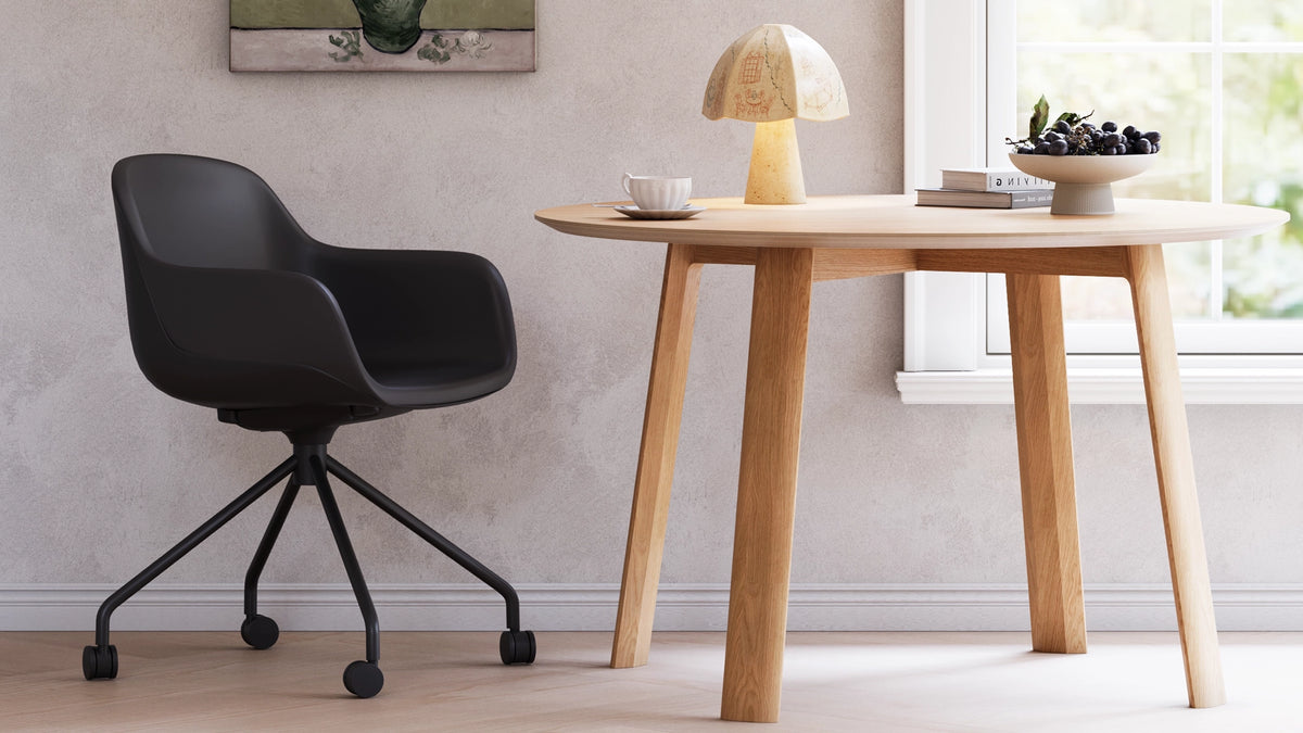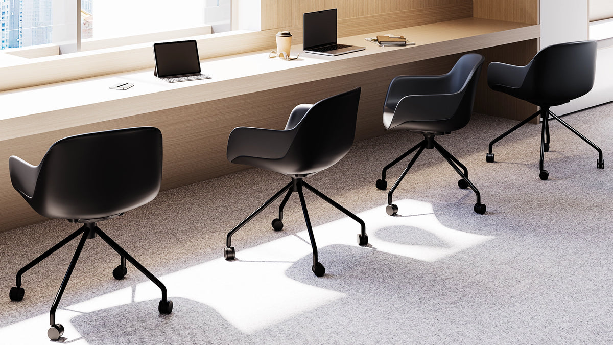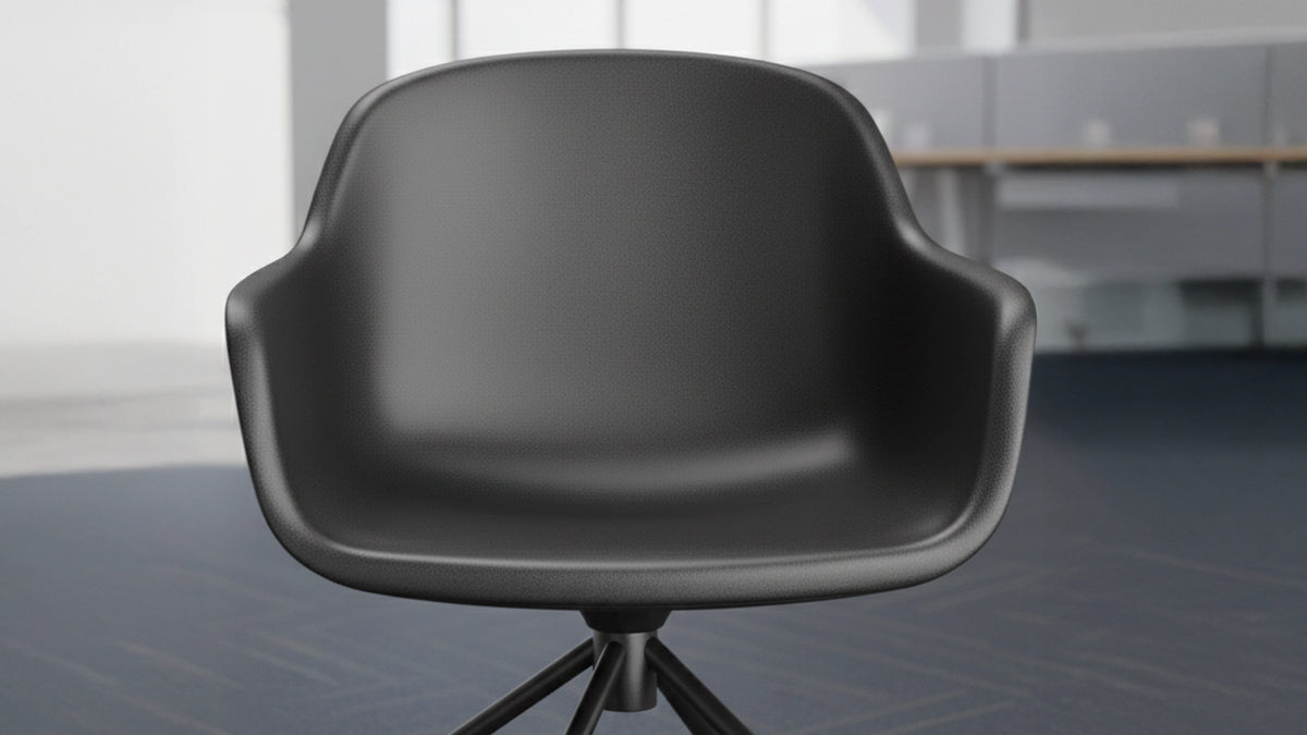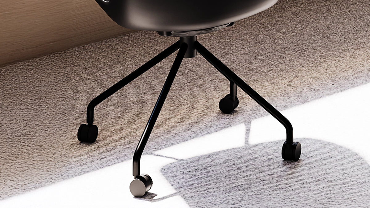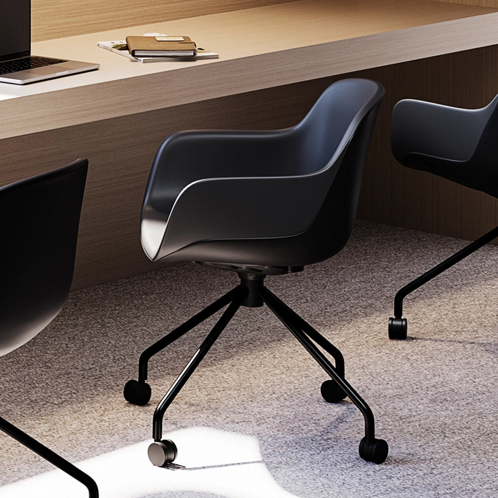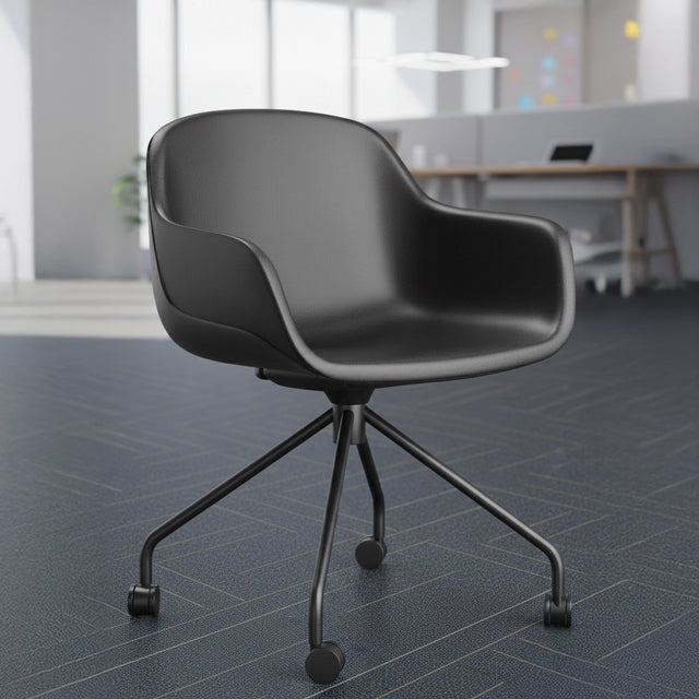 Enhance your workspace with this modern cushioned task chair, designed for comfort, durability, and productivity. Its smooth, contoured shell and padded vinyl seat provide all-day support, while the reinforced steel frame ensures stability and long-lasting performance. Smooth-rolling casters and a 360° swivel base make it easy to move between desks or collaborative areas, and the ergonomic design supports natural posture during long work sessions. Built with sustainability in mind, it reduces plastic use without compromising strength or style, making it ideal for home offices, professional workspaces, and creative studios.